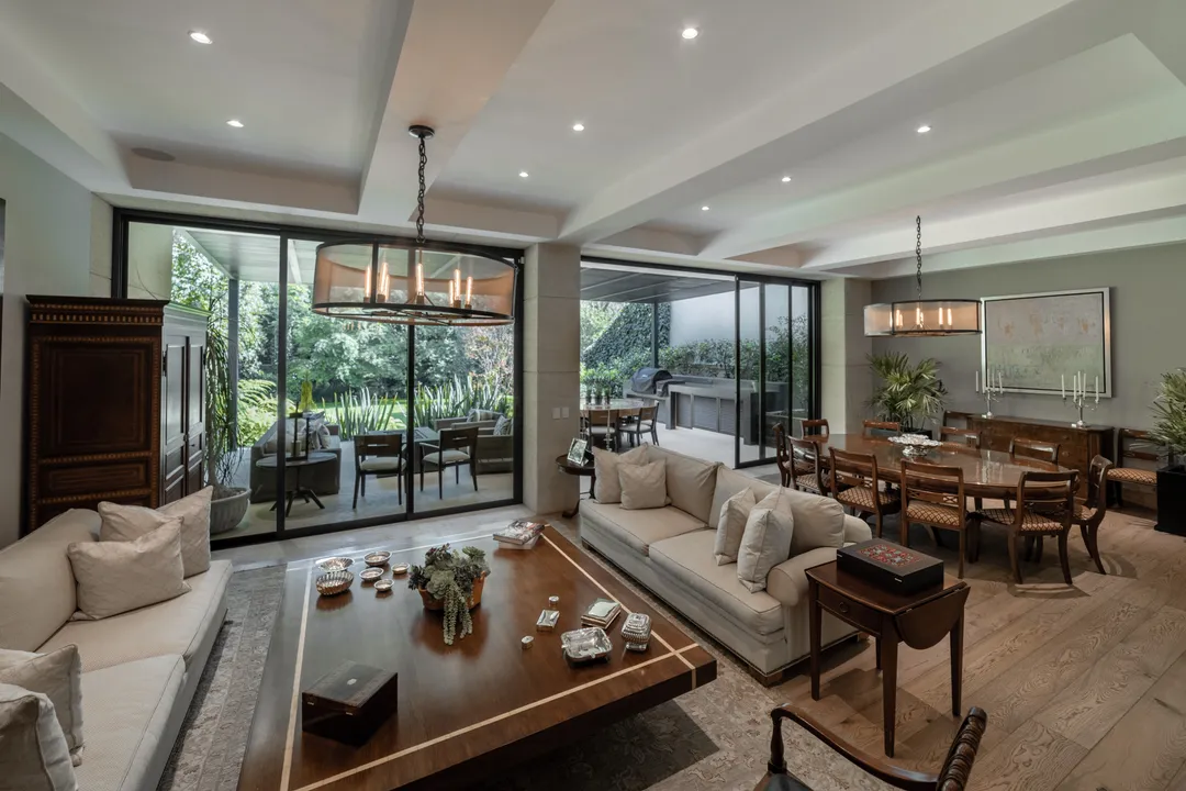 Inside, the highlights include marble and solid walnut wood finishes, as well as a kitchen equipped with appliances from the prestigious brand Thermador. The layout offers four large bedrooms, two service rooms, an elegant dining room, a family room on the upper level, and another on the lower level with direct access to the garden.