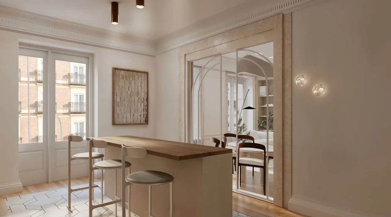 Nolab presents this impressive apartment located in the Justicia neighborhood, one of the most emblematic and sought-after areas of Madrid. It will be delivered fully renovated, combining modern design and high-quality finishes with the charm of its classic architecture.