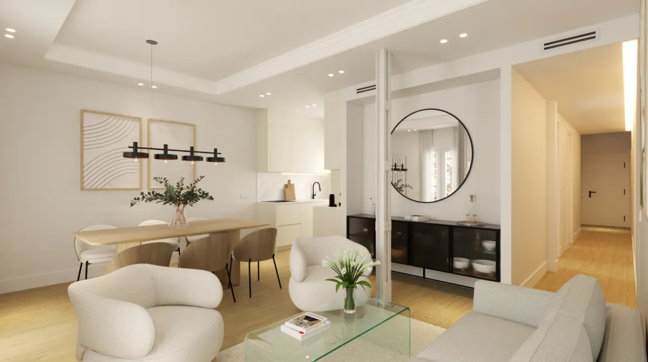 The apartment features 3-meter ceilings and is delivered decorated and furnished.