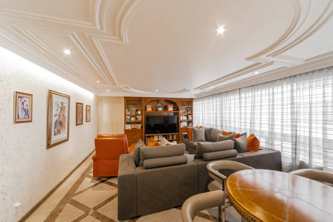 El departamento cuenta con una superficie de aproximadamente 377 metros cuadrados y está ubicado en un moderno edificio de lujo. El diseño interior es elegante y contemporáneo, con acabados de alta calidad y una distribución inteligente del espacio.