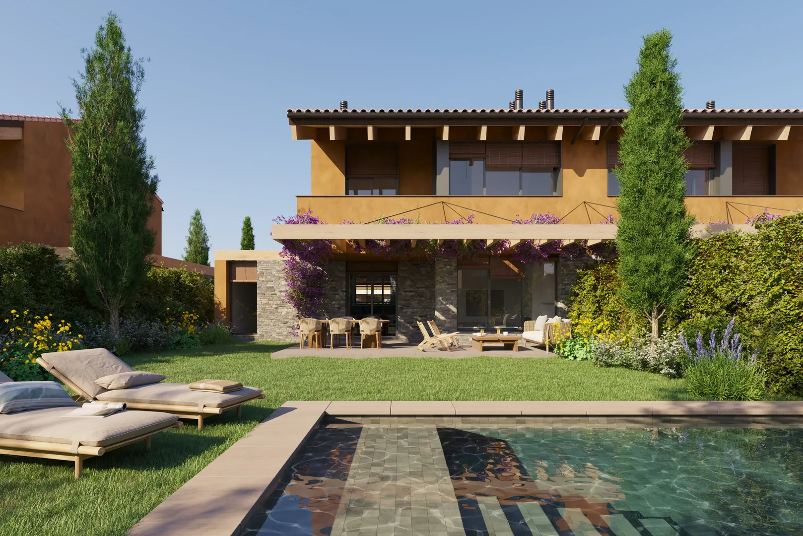 Se trata de una vivienda adosada de nueva construcción situada en una parcela esquinera de 428m² en Regencós, en el corazón del Baix Empordà, Costa Brava, Cataluña. La propiedad dispone de una parcela privada con una superficie habitable total de 374m² y una piscina privada orientada al sur.