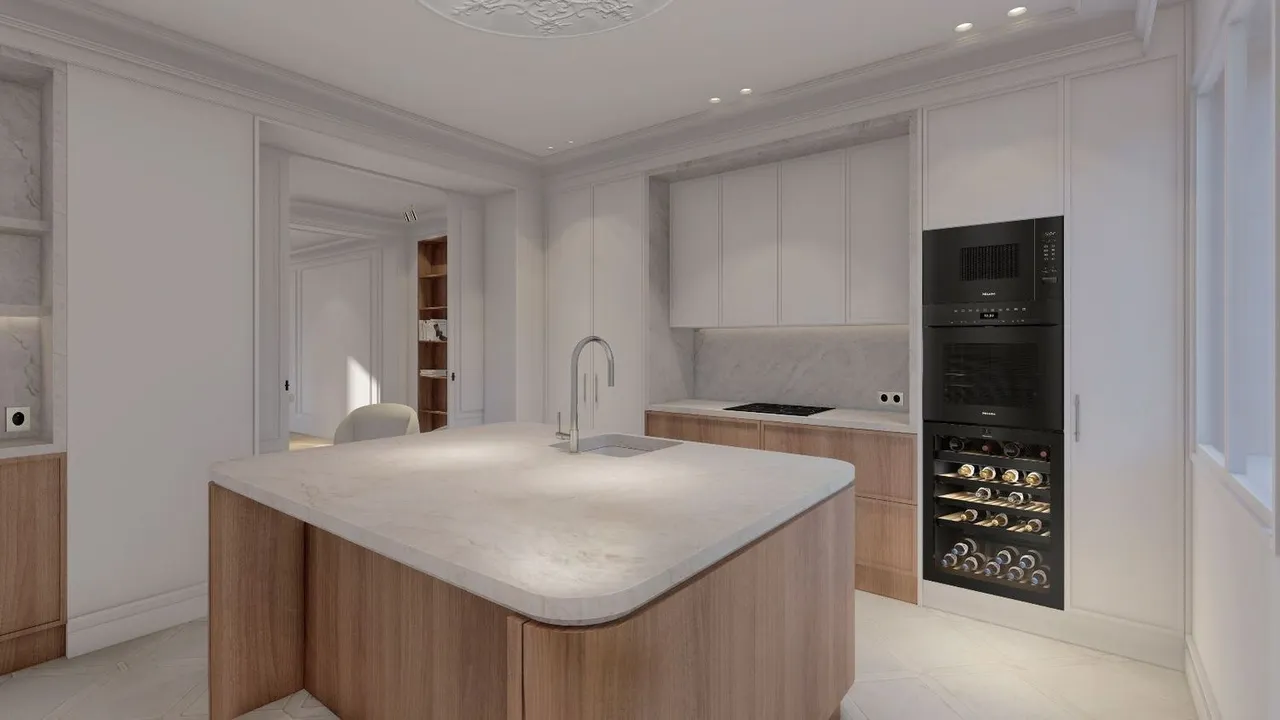 Los techos de tres metros realzan la sensación de amplitud y luminosidad, fusionando el encanto clásico con un diseño contemporáneo. La reforma comenzará en febrero de 2025 y finalizará en julio, permitiendo personalizar la vivienda al gusto del comprador.