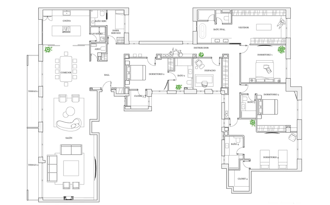 Un pasillo distribuidor conduce a un despacho y a cuatro amplios dormitorios dobles, cada uno en suite y equipado con vestidor, garantizando espacios generosos y confortables.