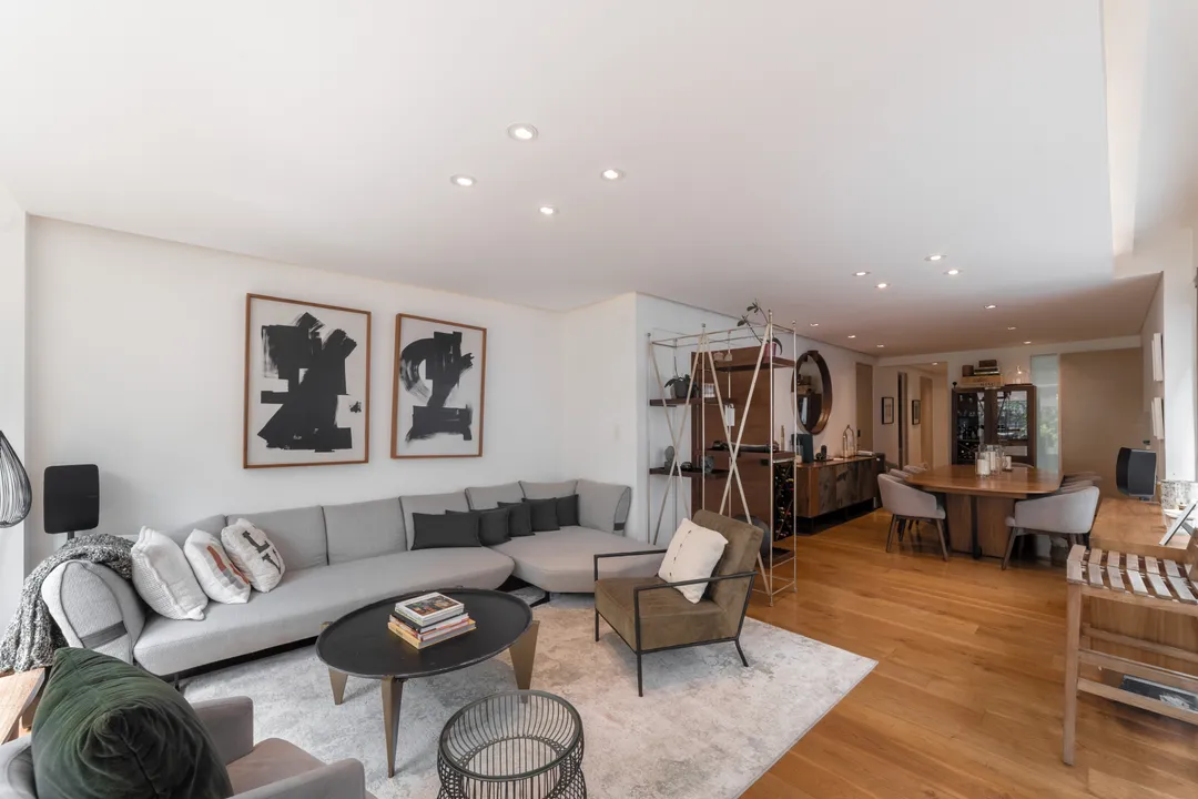 Este amplio departamento de 167 m² cuenta con dos recámaras, cuarto de servicio, dos baños completos, un medio baño adicional y baño en el área de servicio.